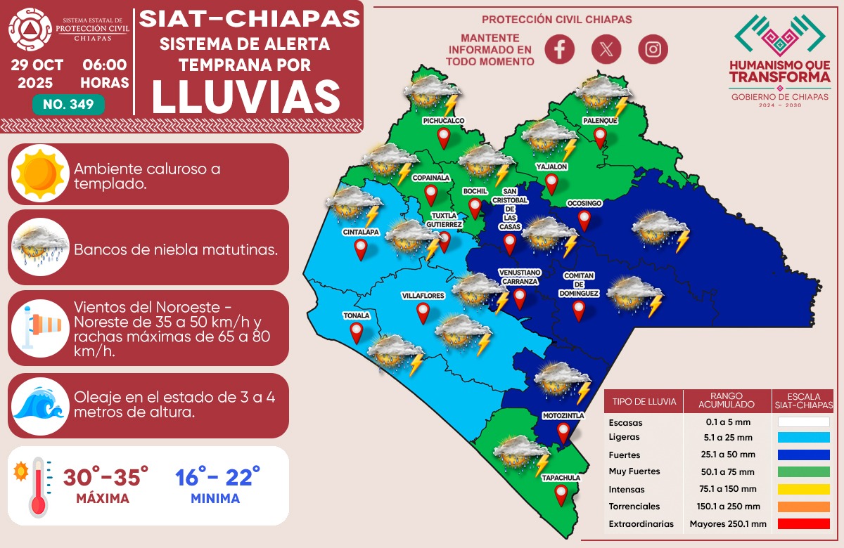 Hoy, 29 de octubre de 2025, el Sistema de Alerta Temprana por Lluvias (SIAT) de Protección Civil Chiapas emite el pronóstico de lluvias en nuestro estado. ¡Tome sus precauciones y manténgase informado en todo momento a través de redes oficiales! Ante cualquier emergencia, llama al 911.